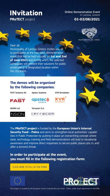 FAST Systems has been nominated to participate in the demonstration event of the PRoTECT project on June 1st and 2nd - see youtube invitation. The online event is hosted by the municipality of Larissa, Greece, and selected companies will present their solutions for public safety and protection.