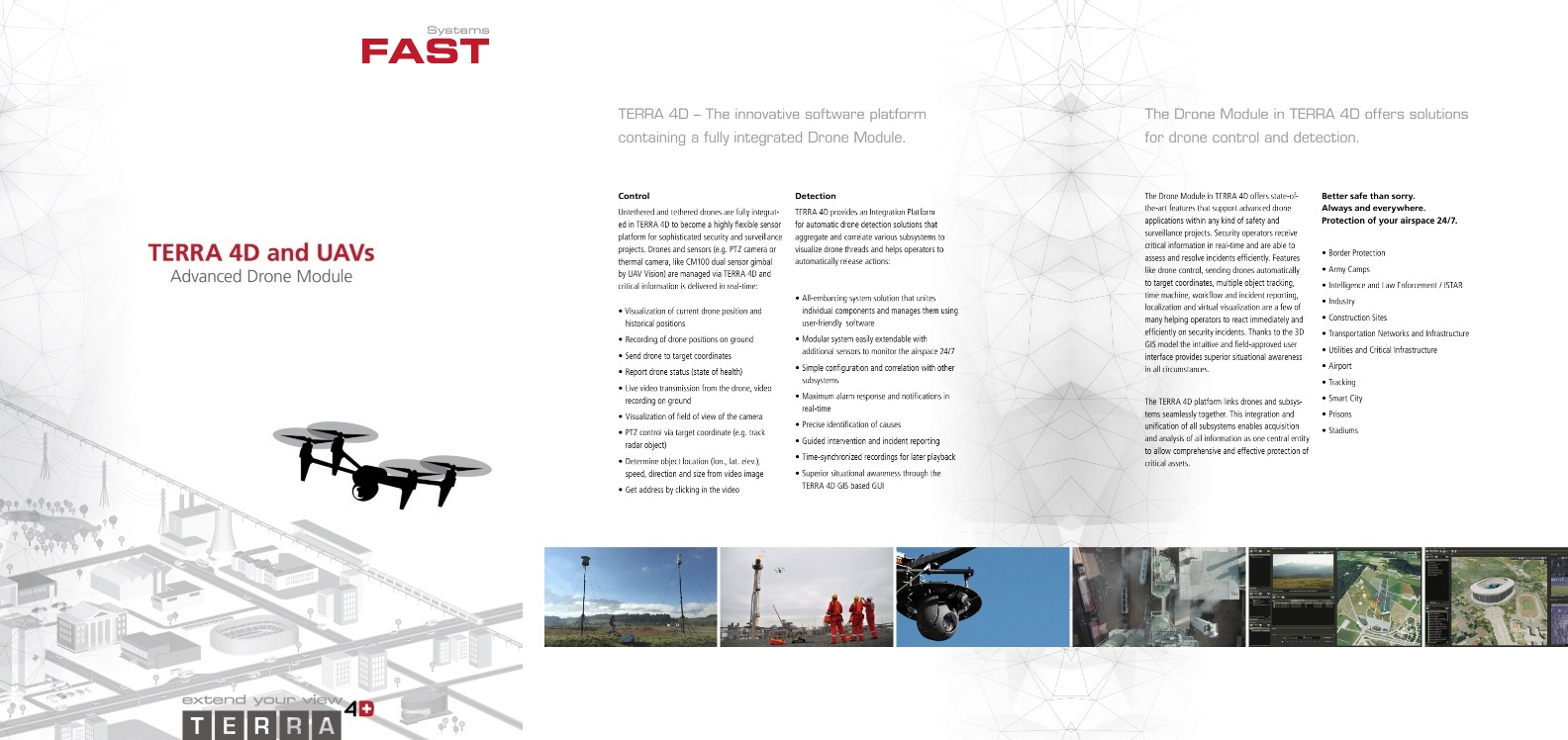 Thanks to the 3D GIS model the intuitive and field-approved user interface provides superior situational awareness in all circumstances. The TERRA 4D platform links drones and subsystems seamlessly together. This integration and unification of all subsystems enables acquisition and analysis of all information as one central entity to allow comprehensive and effective protection of critical assets.
