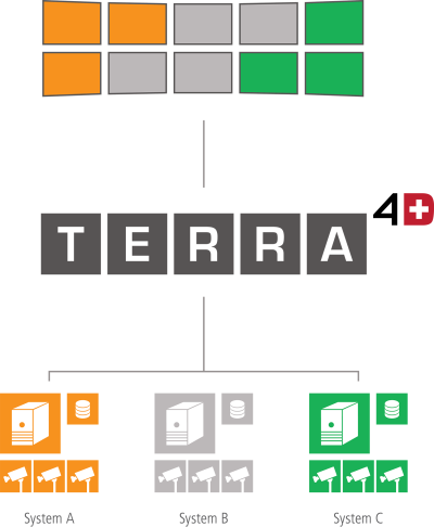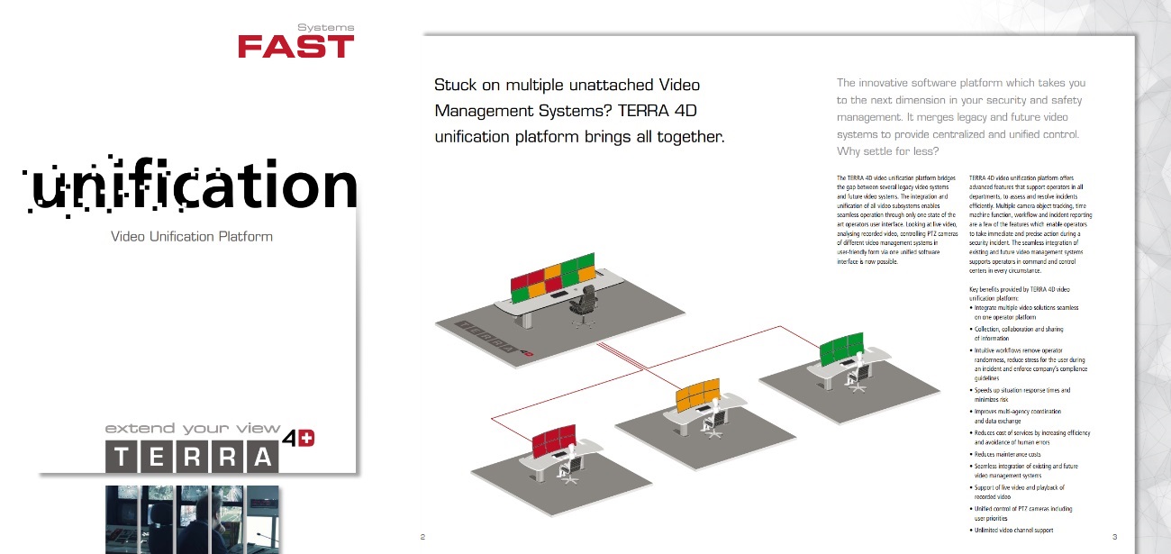 The TERRA 4D video unification platform bridges the gap between several legacy video systems and future video systems. The integration and unification of all video subsystems enables seamless operation through only one state of the art operators user interface. Looking at live video, analysing recorded video, controlling PTZ cameras of different video management systems in user-friendly form via one unified software interface is now possible.